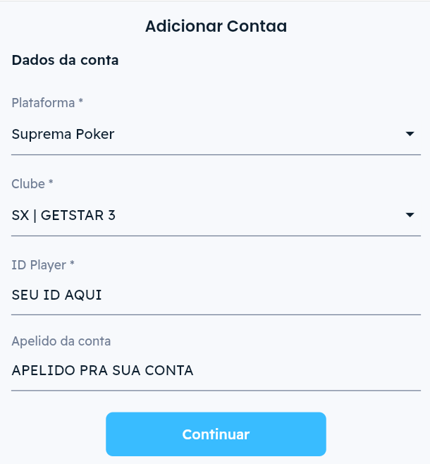 Clique em “Meus IDs” e depois em “Adicionar Conta”. Agora Selecione “Suprema Poker” no campo Plataforma. No clube pesquise por “SX | Getstar 3”. Depois disso, insira seu ID (que você encontra no App da Suprema) e se quiser crie um apelido para identificar sua conta.